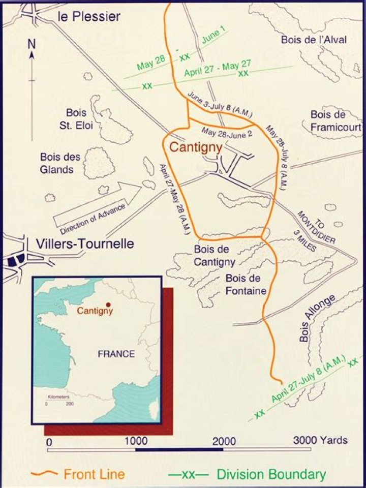 The Battle of Cantigny, fought May 28, 1918 was the first major American battle and offensive of World War I. The U.S. 1st Division, the most experienced of the five American divisions then in France and in reserve for the French Army near the village of Cantigny, was selected for the attack.