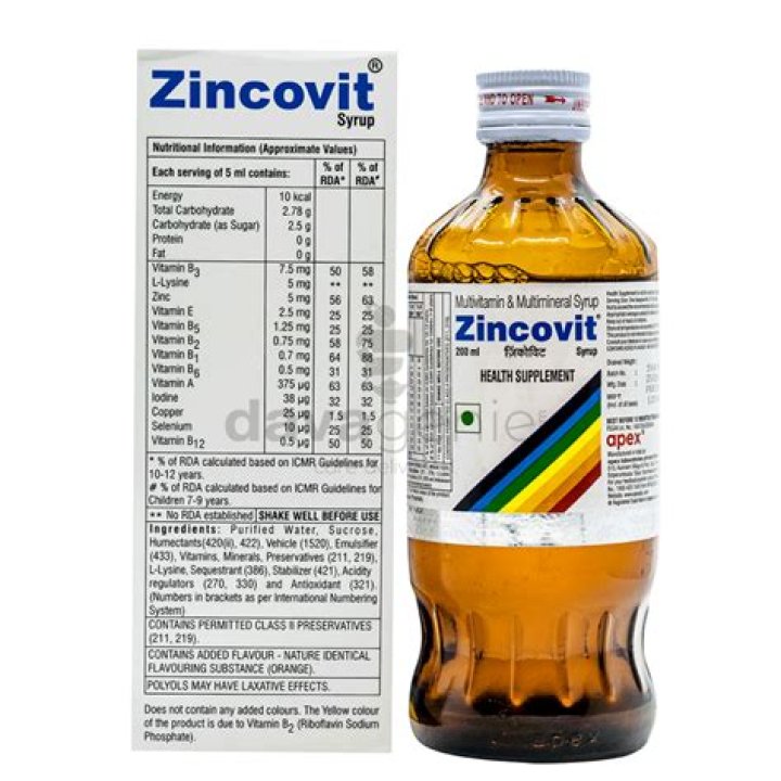Zincovit Syrup is a Syrup manufactured by APEX LABS. It is commonly used for the diagnosis or treatment of age related vision loss , aids, acne. It has some side effects such as Allergic reactions,Allergic sensitization,Abdominal cramps,Allergic reaction.