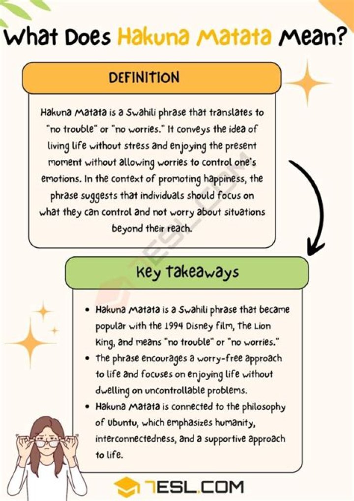 "Hakuna matata" is a Swahili language phrase from East Africa, meaning "no trouble" or "no worries" and "take it easy". The 1994 Walt Disney Animation Studios animated film The Lion King brought the phrase to Western prominence in one of its most popular songs, in which it is translated as "no worries".
