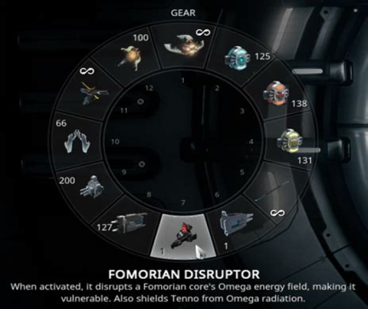 The Fomorian Disruptor is a special Gear item essential in fighting against Grineer Balor Fomorians by disrupting the defenses surrounding their power cores.