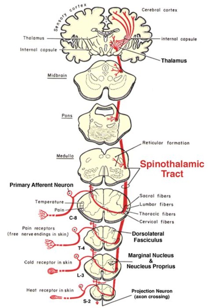 The sensory fibres of pain and temperature enter the spinal cord and cross to the opposite spinothalamic tract a few segments up. The tract then ascends to the brainstem. pain testing - use a new pin. The sharpness of the pin is demonstrated to the patient, e.g. by gently touching his anterior chest wall.