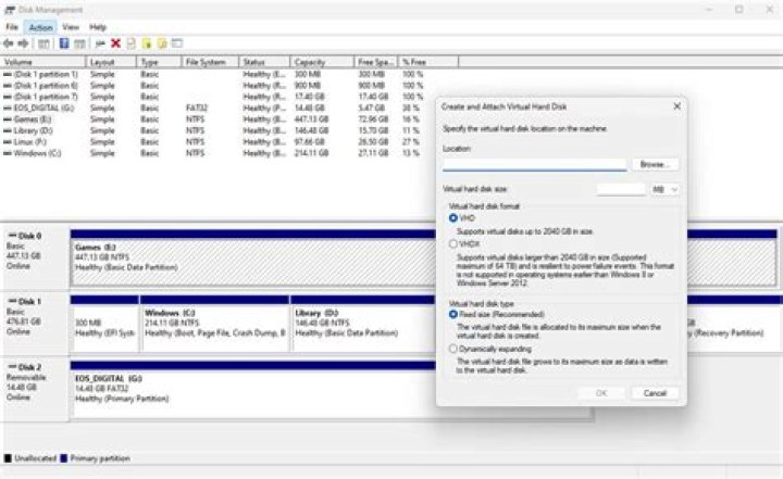 - In Disk Management, select Action > Create VHD from the menu.