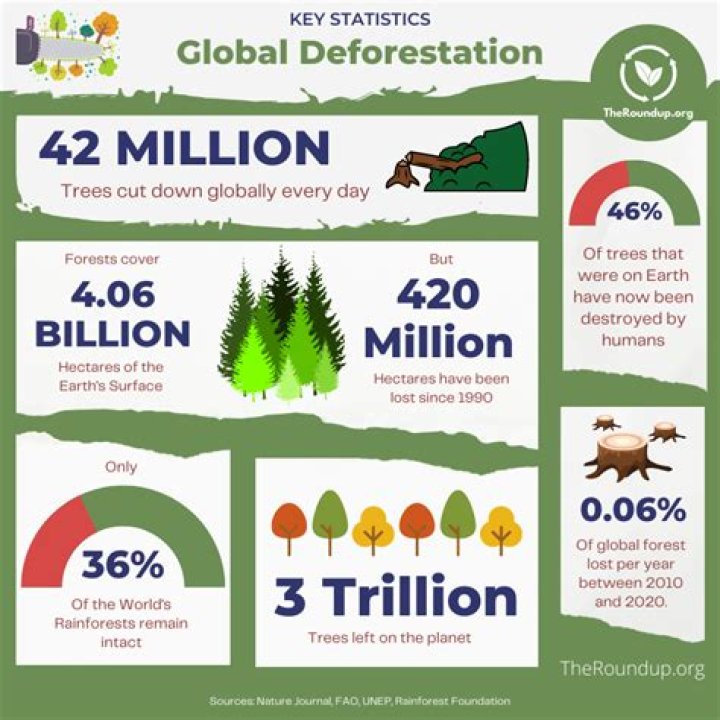 Of the approximately 14.5 million square kilometres of tropical rainforest that once covered Earth's surface, only 36 % remains intact. Just over a third, 34 %, is completely gone and the last 30 % is in various forms of degradation. Of the current rainforest cover, almost half (45 %) is in a degraded state.